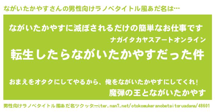 | 女子向けラノベタイトル風あだ名 | 『ながいたかやすの玉の輿計画!』 |
