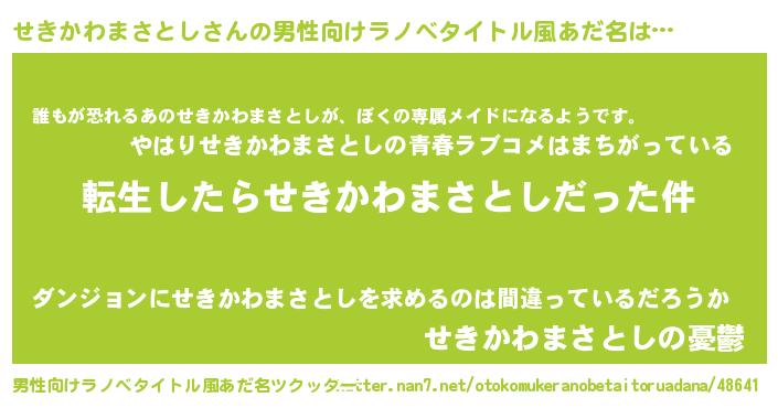 | 女子向けラノベタイトル風あだ名 | 『婚約破棄系悪役せきかわまさとしに転生したので、保身に走りました。』 |