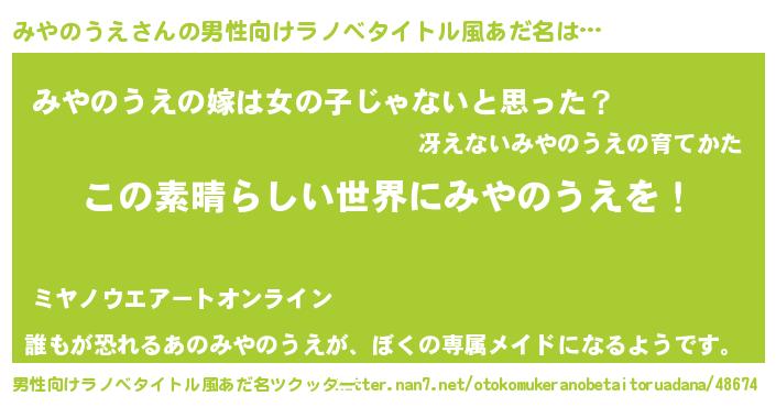 | 女子向けラノベタイトル風あだ名 | 『悪役みやのうえに転生したようですが、知った事ではありません』 |