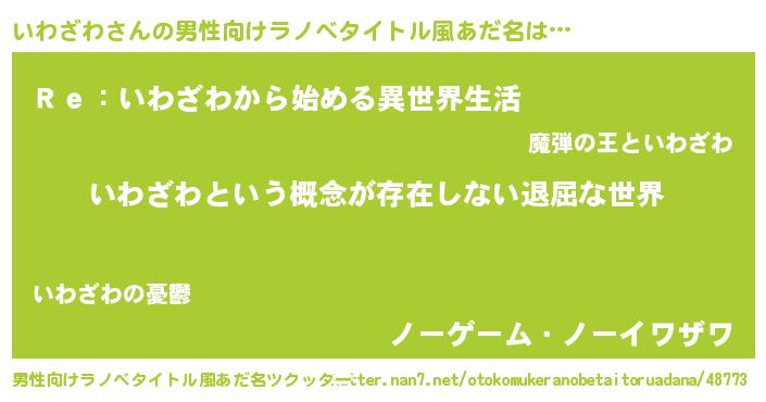 | 女子向けラノベタイトル風あだ名 | 『異世界で失敗しない100のいわざわ』 |