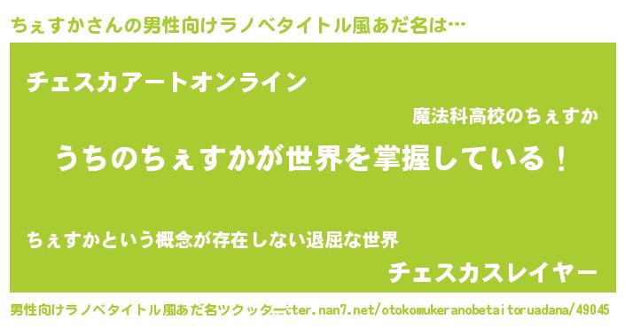 | 女子向けラノベタイトル風あだ名 | 『男装ちぇすかの憂鬱な任務』 |