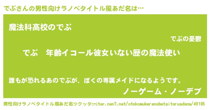 | 女子向けラノベタイトル風あだ名 | 『でぶの玉の輿計画!』『死神でぶの再婚』 |