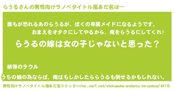 | 女子向けラノベタイトル風あだ名 | 『らうる様がみてる』『らうるの契約王妃』 |