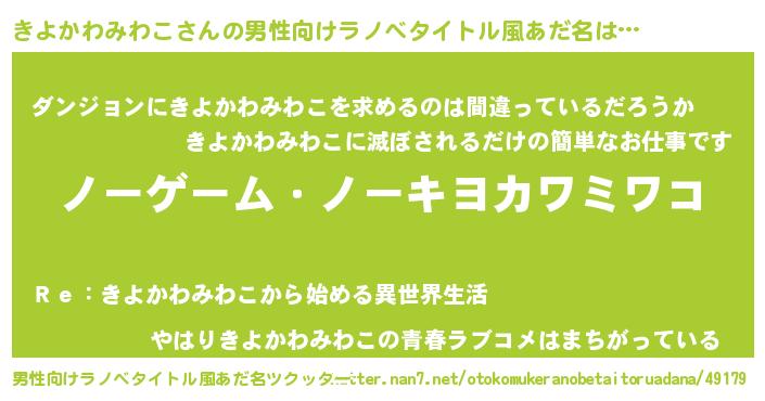 | 女子向けラノベタイトル風あだ名 | 『死神きよかわみわこの再婚』 |
