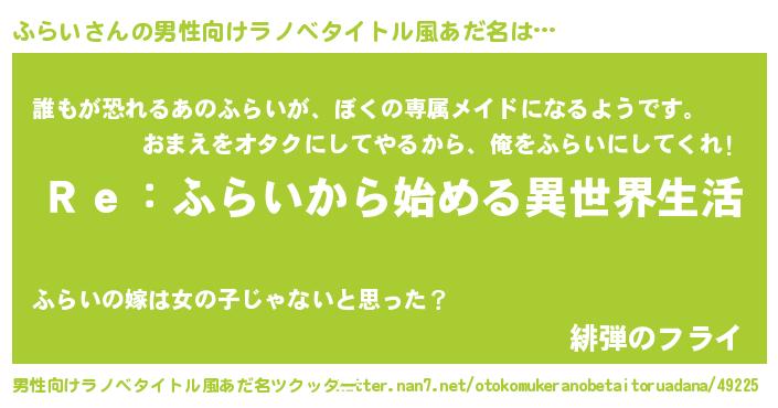 | 女子向けラノベタイトル風あだ名 | 『闇のふらい』『ふらい夫妻のなれそめ』 |