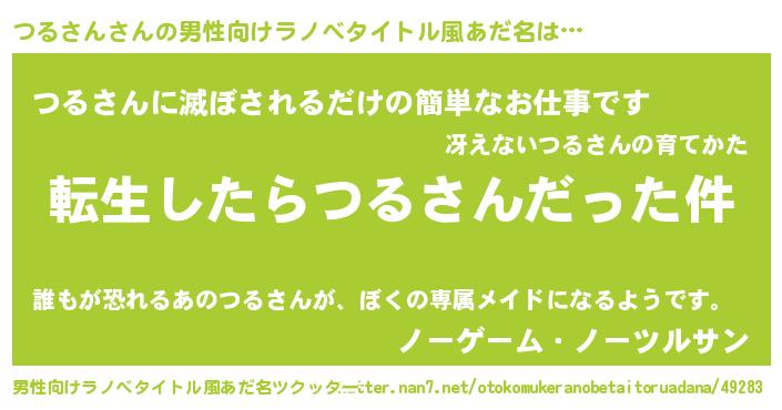 | 女子向けラノベタイトル風あだ名 | 『つるさんの玉の輿計画!』 |