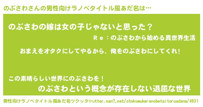 | 女子向けラノベタイトル風あだ名 | 『のぶさわ夫妻のなれそめ』 |