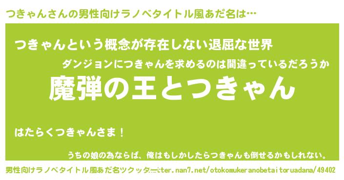 | 女子向けラノベタイトル風あだ名 | 『つきゃんが死なない童話 林檎のつきゃんの診療簿』 |