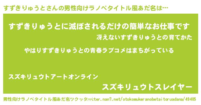 | 女子向けラノベタイトル風あだ名 | 『すずきりゅうとの雑貨屋さん』 |