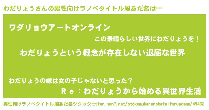 | 胡散臭い通販商品みたいなあだ名 | 『来世でも幸せになれる健康食品…その名も「わだりょう」』 |
