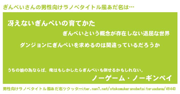 | 女子向けラノベタイトル風あだ名 | 『ぎんぺいの卵を拾いまして』 |