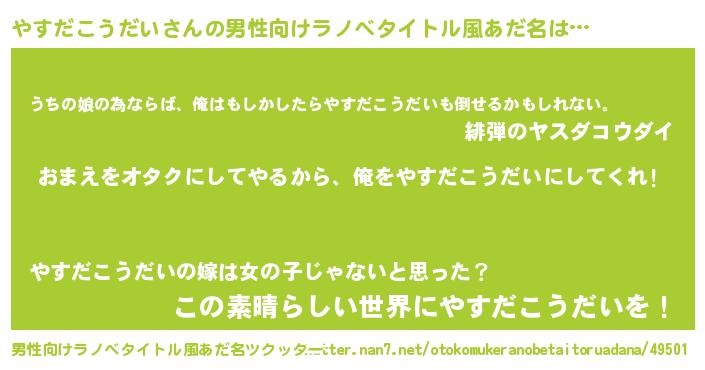 | 女子向けラノベタイトル風あだ名 | 『やすだこうだい夫妻のなれそめ』 |