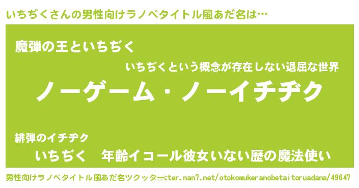 | 女子向けラノベタイトル風あだ名 | 『死神いちぢくの再婚』 |