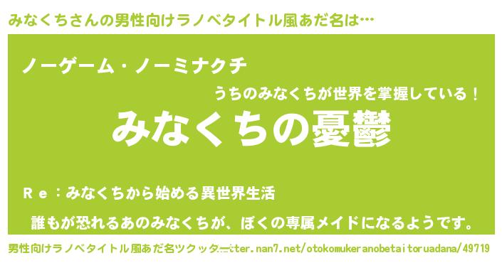 | 女子向けラノベタイトル風あだ名 | 『(仮)みなくちのやんごとなき事情』 |