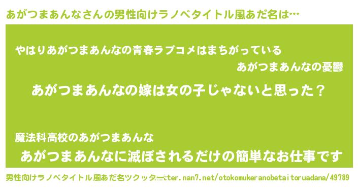| 女子向けラノベタイトル風あだ名 | 『あがつまあんな様がみてる』 |