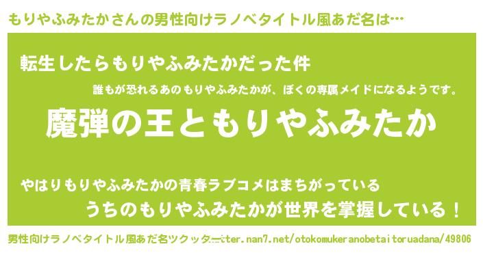 | 女子向けラノベタイトル風あだ名 | 『乙女ゲームの破滅フラグしかない悪役もりやふみたかに転生してしまった…』 |
