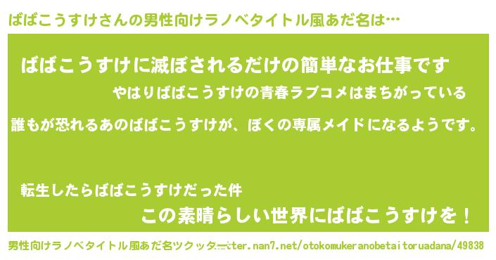 | 女子向けラノベタイトル風あだ名 | 『異世界でカフェばばこうすけを開店しました。』 |