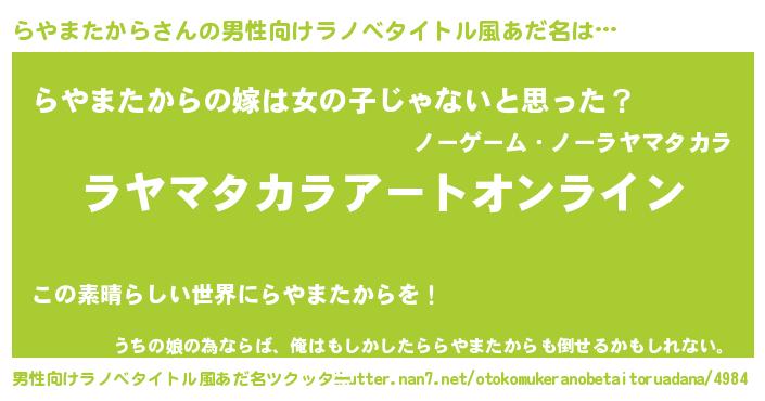 | 胡散臭い通販商品みたいなあだ名 | 『モテモテ間違いなし霊験あらたかなお札…その名も「らやまたから」』 |