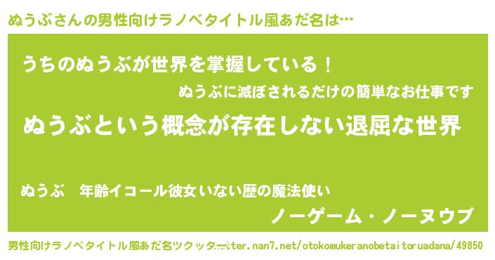 | 女子向けラノベタイトル風あだ名 | 『異世界で失敗しない100のぬうぶ』 |