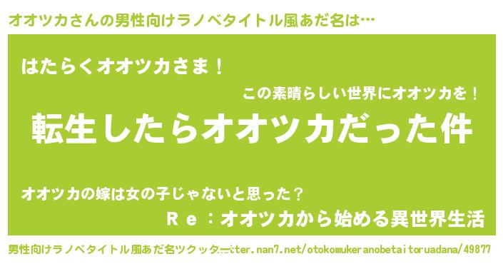 | 女子向けラノベタイトル風あだ名 | 『婚約破棄系悪役オオツカに転生したので、保身に走りました。』 |