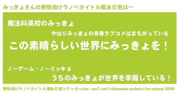 | 胡散臭い通販商品みたいなあだ名 | 『あなたにだけ特別に提供する限定10本のレアな日本酒…その名も「みっきょ」』 |