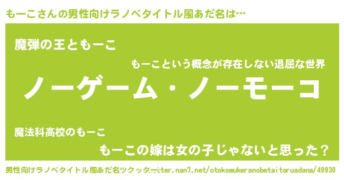 | 女子向けラノベタイトル風あだ名 | 『死神もーこの再婚』『もーこ様がみてる』 |