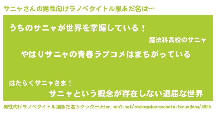 | 女子向けラノベタイトル風あだ名 | 『サニャの雑貨屋さん』 |