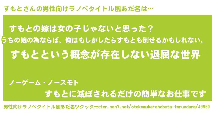 | 女子向けラノベタイトル風あだ名 | 『異世界で失敗しない100のすもと』 |