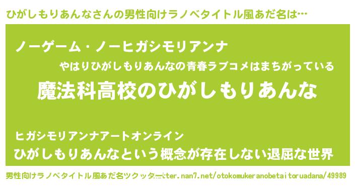 | 女子向けラノベタイトル風あだ名 | 『ひがしもりあんななんてお断りですっ。』 |