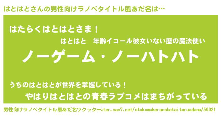 | 女子向けラノベタイトル風あだ名 | 『死神はとはとの再婚』 |