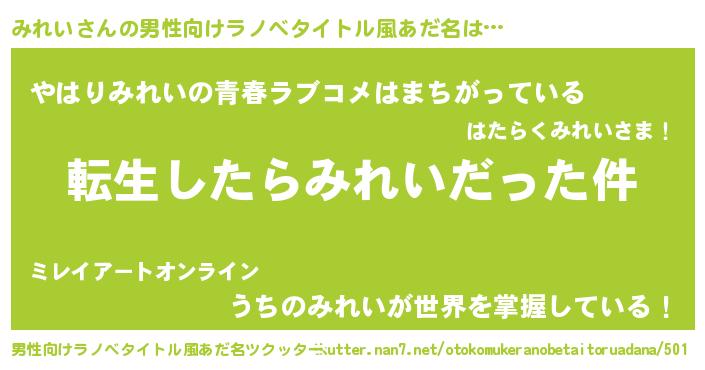 | 女子向けラノベタイトル風あだ名 | 『みれいの玉の輿計画!』 |