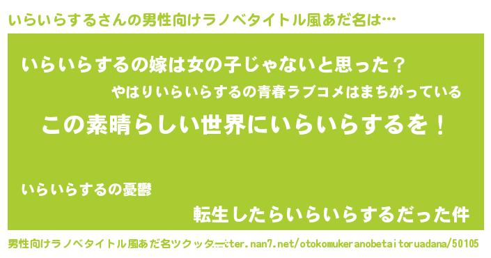 | 女子向けラノベタイトル風あだ名 | 『乙女ゲームの破滅フラグしかない悪役いらいらするに転生してしまった…』 |