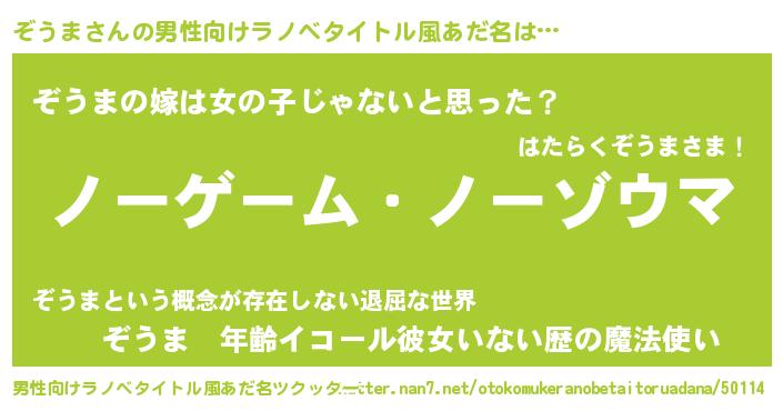 | 女子向けラノベタイトル風あだ名 | 『死神ぞうまの再婚』『ぞうま様がみてる』 |
