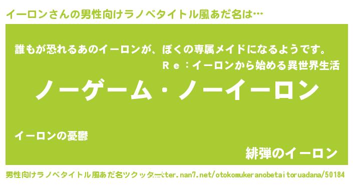 | 女子向けラノベタイトル風あだ名 | 『死神イーロンの再婚』 |