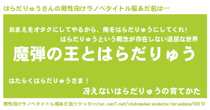 | 女子向けラノベタイトル風あだ名 | 『はらだりゅうが死なない童話 林檎のはらだりゅうの診療簿』 |