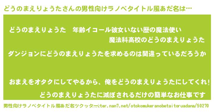 | 胡散臭い通販商品みたいなあだ名 | 『信頼と実績のサプリメント…その名も「どうのまえりょうた」』 |
