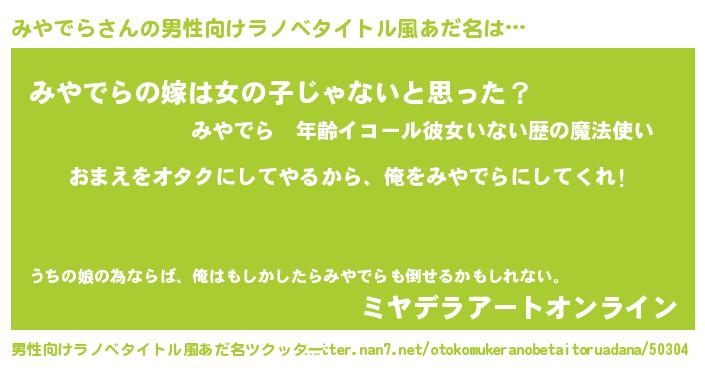 | ヒーロー風カッコイイあだ名 | 『愛の使者みやでら』『天弓騎士ミヤ』 |