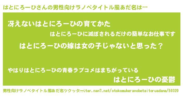 | 女子向けラノベタイトル風あだ名 | 『はとにろーひの卵を拾いまして』 |