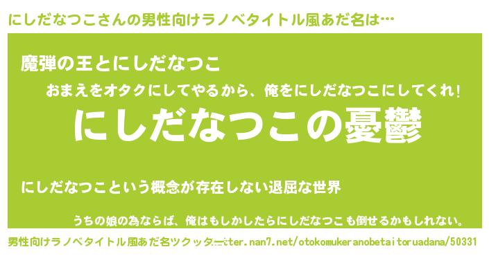 | 女子向けラノベタイトル風あだ名 | 『(仮)にしだなつこのやんごとなき事情』 |