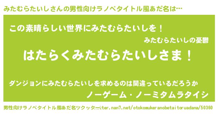 | 胡散臭い通販商品みたいなあだ名 | 『世界中を虜にした世界で10本だけ現存している希少なブランデー…その名も「みたむらたいし」』 |