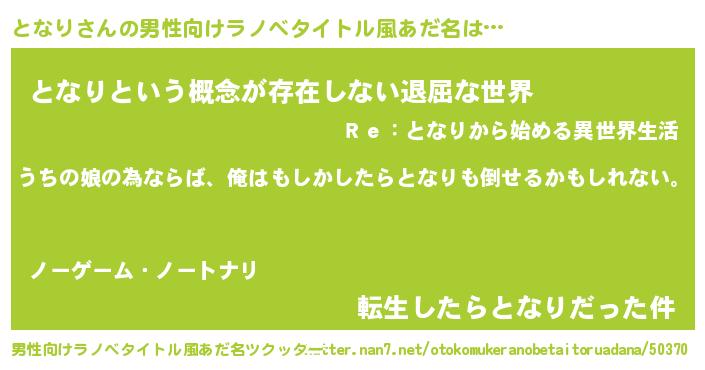 | ヒーロー風カッコイイあだ名 | 『ウルトラとなりマン』『ネオトナリ』 |