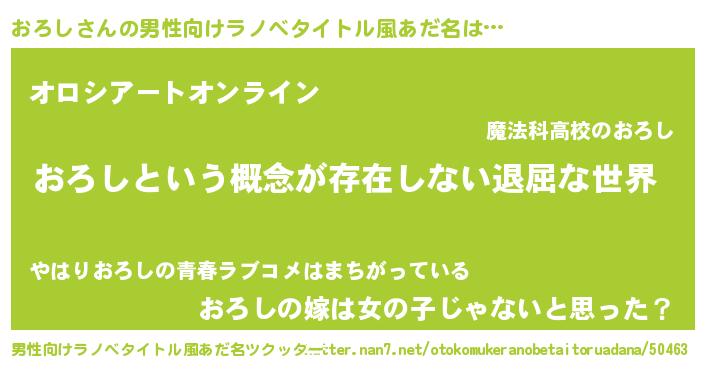 | 女子向けラノベタイトル風あだ名 | 『おろしの契約王妃』『おろし様がみてる』 |