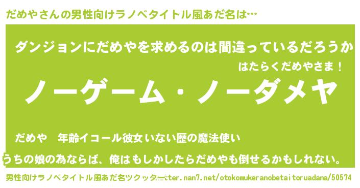 | 女子向けラノベタイトル風あだ名 | 『死神だめやの再婚』『だめや伯爵の花嫁』 |