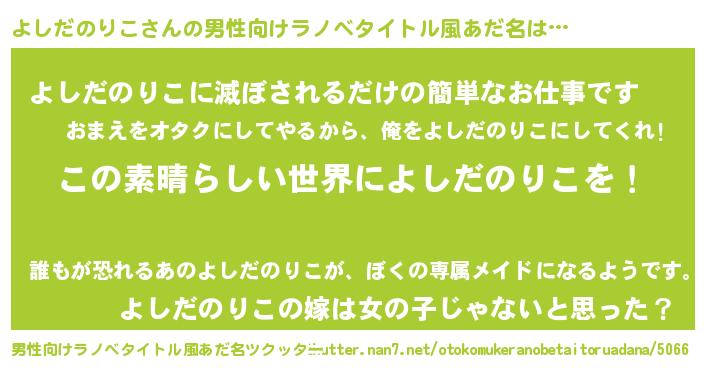 | 女子向けラノベタイトル風あだ名 | 『乙女ゲームの破滅フラグしかない悪役よしだのりこに転生してしまった…』 |