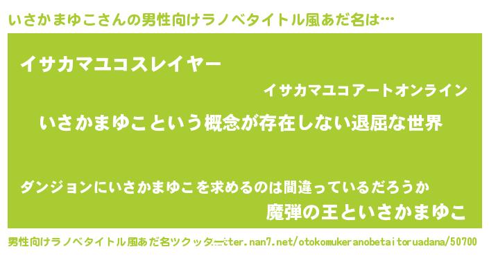 | 女子向けラノベタイトル風あだ名 | 『異世界で失敗しない100のいさかまゆこ』 |