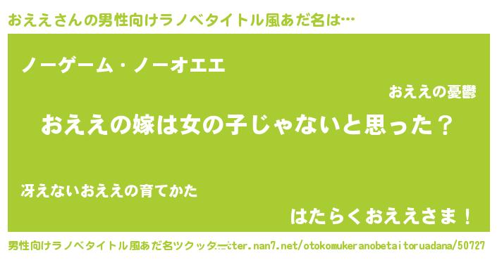 | 女子向けラノベタイトル風あだ名 | 『おええの卵を拾いまして』 |