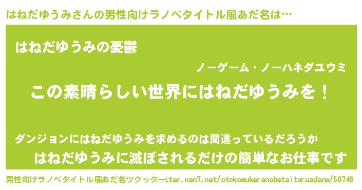 | 女子向けラノベタイトル風あだ名 | 『乙女ゲームの破滅フラグしかない悪役はねだゆうみに転生してしまった…』 |