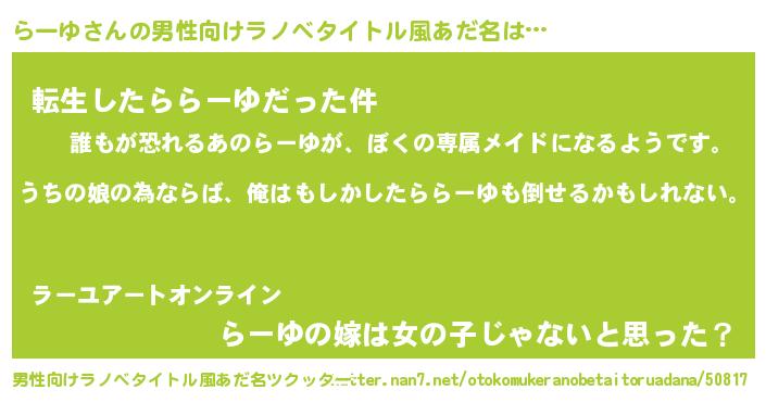 | 女子向けラノベタイトル風あだ名 | 『らーゆの婚約者』 |