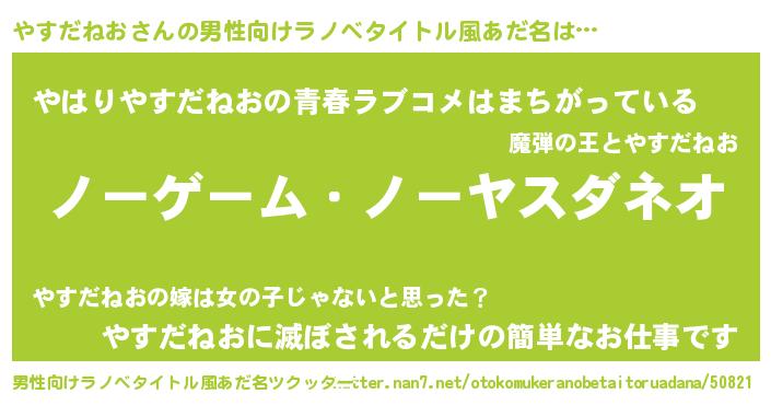| 女子向けラノベタイトル風あだ名 | 『死神やすだねおの再婚』 |