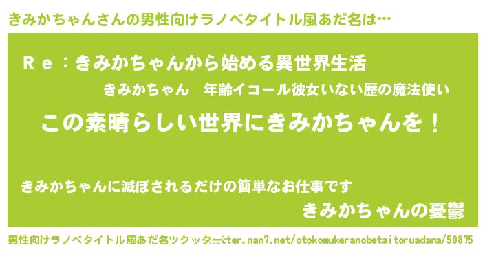 女子向けラノベタイトル風あだ名 | 『乙女ゲームの破滅フラグしかない悪役きみかちゃんに転生してしまった…』 |